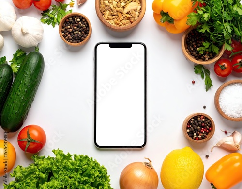 food, healthy eating, fresh, background, cooking, health food, diet, ingredient, cookery, ingredient, white, vegetable, vegetarian, pepper, garlic, culinary, natural, receipe, nourishment, table, overhead, raw, fresh vegetable, mobile phone, smartphone, gastronomy, parsley, cucumber, tomatoes, peppercorn, organic food, balanced diet, lifestyle, vitamin, dieting, well-being, kitchen