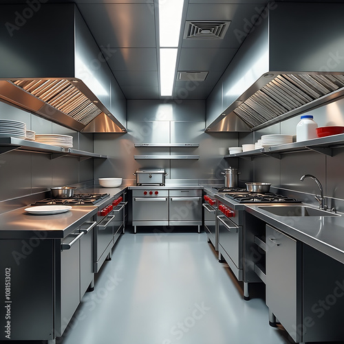 Modern stainless steel commercial kitchen with sleek design and professional culinary equipment ready for gourmet cooking