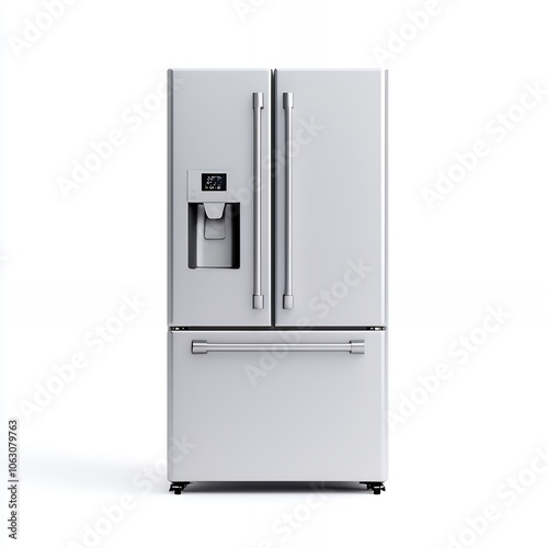 appliance, kitchen, home, refrigerator, stainless, steel, door, french, ice, water, dispenser, modern, new, clean, white, background, isolated, cold, food, drink, storage, deep freezer, fresh, cooling