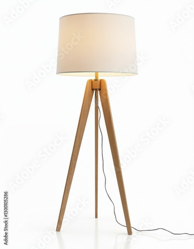 Modern stylish floor lamp with bright lampshade isolate on white background. Contemporary design tripod made of natural wood brings warm light, soft illumination in interior. Home decor element.