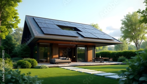 Modern Sustainable Home with Solar Panels Green Landscaping and Patio