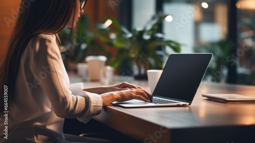 Modern Technology for Remote Work: Woman Using 2020 Laptop on Wooden Desk in Home Office.