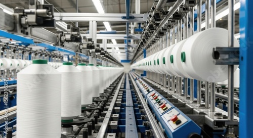 Modern Textile Manufacturing Facility with Rows of Yarn Spools
