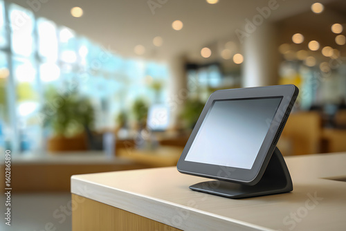 Modern touch screen POS system on counter in bright, blurred retail environment
