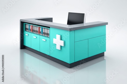 reception, desk, medicals, office, clinic, hospital, health care, furniture, modern, turquoise, water, teal, grey, counter, monitor, computer, file, folder, storage, cabinet, drawer, design, three-dimensional, rendering, interior, equipment, professional, health, care, workspace, contemporary, stylish, clean, minimalist, efficient, organisation, practical, technology, plus, symbol, bright