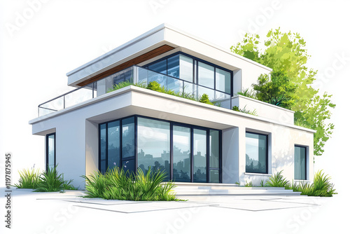 Modern two-story house, expansive windows, rooftop garden, landscaped grounds.