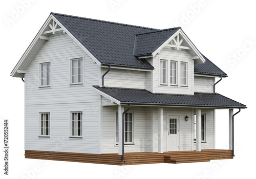 Modern two-story white wooden house with black roof and front porch, residential architecture design for family living and real estate property, isolated on white background