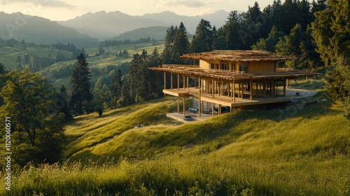 house, home, building, architecture, modern, wood, wooden, construction, unfinished, hill, hill, mountain, mountain, landscape, scenery, nature, rural, view, scenic, green, grass, field, tree, forest, summer, sunlight, sun, gold, light, sky, eco, sustainable, design, contemporary, property, real estate, tranquil, peaceful, serene, idylli, majestic, beauty, environment, dwelling