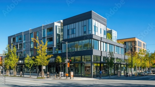 building, street, city, architecture, modern, urban, skyscraper, contemporary, exterior, facades, glasses, concrete, design, window, downtown, sidewalk, commercial, retail, shop, office, apartment, residential, real, estate, landscape, tree, sky, blue, sunny, day, daylight, city landscape, horizon, scene, view, perspective, ground, level, photo, photo, image, colours
