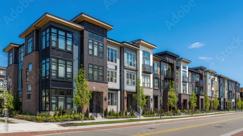 modern, urban, row house, architecture, residential, building, exterior, design, landscape, home, property, neighbourhood, structure, sky, sunlight, tree, front yard, pavement, road, grass, window, facades, urban living, community, contemporary, real estate, suburb, investment, city landscape, greenery, housing, residential area, new construction, urban development, calmness, environment, blue skies, new home, scenic