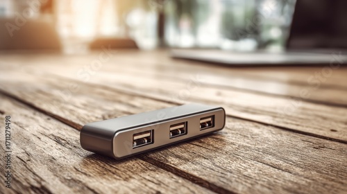 Modern USB Hub on Wooden Table in Contemporary Workspace with Soft Lighting and Laptop in Background