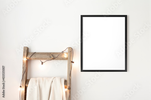 Modern, vertical, 16x20 black frame mockup hanging on a wall. Wooden blanket ladder with globe light string prop.