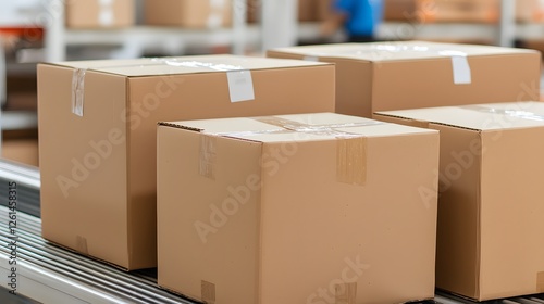 Modern Warehouse with Cardboard Boxes on Conveyor Belt System