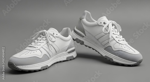 Modern White and Grey Athletic Sneakers Isolated on a Neutral Grey Background
