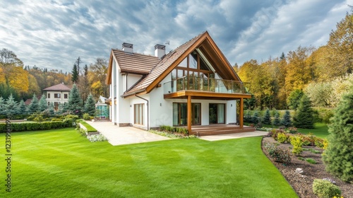 house, modern, white, wooden, accent, balcony, autumn, setting, landscape, grass, lawn, tree, forest, sky, cloud, garden, landscaping, exterior, home, architecture, design, real, estate, property, luxury, residential, comfortable, elegant, roomy, window, door, roof, patio, deck, plant, flower, shrub, greenery, natural, serene, beautiful, tranquil
