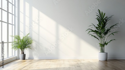 Modern white kitchen design showcases the beauty of natural wood finishes paired with lush potted plants. Sunlight streams through large windows, creating a serene atmosphere
