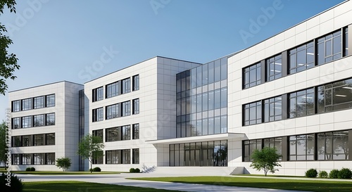 Modern White Office Building with Large Windows and Green Lawn.