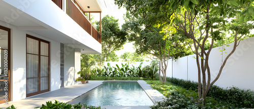 architecture, backyard, building, contemporary, day, daylight, exterior, garden, grass, green, home, house, landscape, lawn, leaf, lifestyle, luxury, modern, nature, outdoors, outside, path, peaceful, plant, pool, property, real estate, relaxation, residence, residential, scene, serene, shrub, sky, summer, sun, sunlight, swimming pool, tranquil, tree, tree, vegetation, villa, water, yard, greenery, design, balcony, whitewall