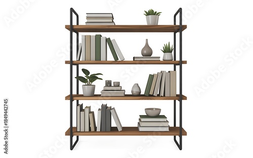 Modern wooden bookshelf with decorative items