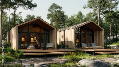 modern, wooden, vacation, surrounded, forest, compact, interior, elevated, lush, coniferous, pine, tranquil, view, creating, cosy, serene, relaxing, ambience, natural, small, architecture, minimalist, design, neighbourhood, nature, comfortable, quiet, lifestyle, greenery, landscape, beauty, rustic, travel, filed, countryside, bungalow, green, roof, village, sleeping, house, ecotourism, tour tourism, cabin, resort