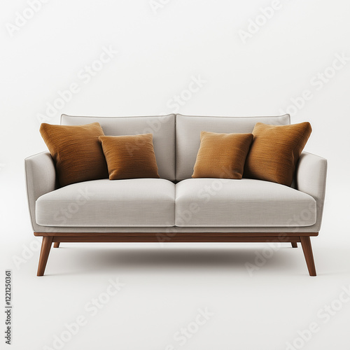 Modern wooden sofa with light gray cushions on a white background, front view.