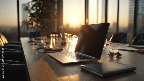 Modern workplace setting with laptop and meeting table