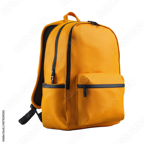 Modern yellow backpack with black zippers, isolated on white background. Minimalist school bag, casual travel rucksack, or stylish student backpack. Perfect for e-commerce, fashion catalog, mockups, p