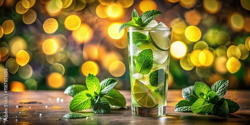 mojito, cocktail, drink, summer, refreshing, mint, lime, garnish, bokeh, closeup, photo, image, alcoholic, nonalcoholic, beverage, bar, party, celebration, tropical, fresh, vibrant, colours, texture, sharpened, blur, background, lighting, food photography, high-quality, realistic, detailed, delicious