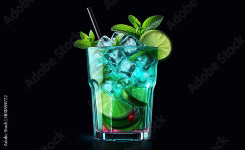 cocktail, drink, mojito, glasses, lime, ice, mint, cold, alcohol, green, lemon, isolated, beverage, water, fruit, juice, white, soda, refreshment, rum, cool, citrous, fresh, leaf, lemonade