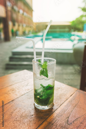 Mojito cocktail with lime and mint in a glass on the table near the swimming pool. Summer sunny day