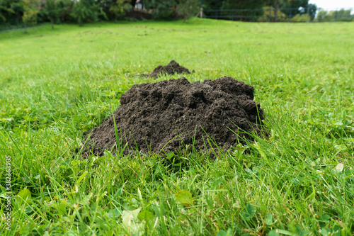 Molehills in a garden lawn or field cause by burrowing mammals such as moles or voles