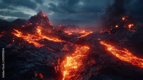 Molten Lava Flowing Over Volcanic Rock Landscape at Dusk
