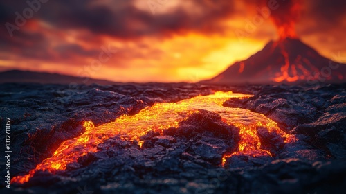 lava, volcano, eruption, volcanic, flow, molten, fire, hot, sunset, landscape, rock, dark, night, stream, river, heat, earth, nature, scene, background, image, illustration, digital, art, fiery, glowing, magma, intense, dramatic, powerful, energy, destruction, danger, hazard, geologic, geography, texture, surface, crater, mountain, smoke, ash, red, orange, yellow, black, power, force, incandescent