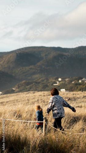 mother, daughter, walking, beach, grass, golden hour