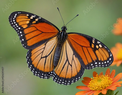 Monarch butterfly, vibrant orange wings, black veins, white spots, yellow flowers, green leaves, soft focus background, macro photography, detailed wings, nature close-up, delicate insect, pollinator,