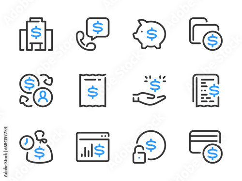 bank, payment, dollar, money, finance, business, icon, vector, set, line, colours, highlight, stroke, bag, banking, building, card, cash, coin, credit, currency, deposit, dividend, document, earning, exchange, financial, folder, hand, income, investing, linear, loan, lock, mortgage, outline, pay, person, phone, baby pig, profit, receipt, savings, service, signs, billfold, wealth, web, website