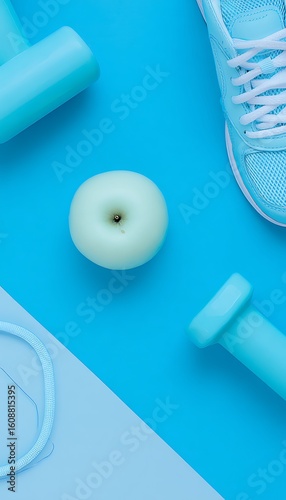 blue, fitness, monochrome, apple, health, sneaker, dumbbell, rope, still life, exercise, wellness, sport, equipment, background, healthy, lifestyle, training, shoe, gym, diet, physical exercise, nourishment, cyan, pastel, minimal, clean, colours, surface, flat, studio, nobody, arrangement, scene, concept, activewear, motivation, modern, topview, health care, active, gear, object