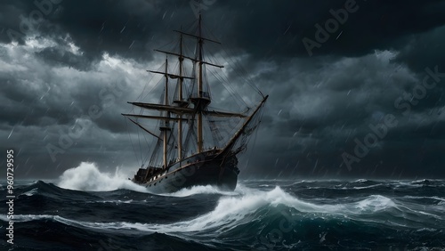 monochrome art a dramatic depiction of a ship caught in a storm, with dark clouds, crashing waves, and a lightning strike illuminating the scene
