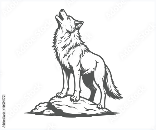 Monochrome Illustration of a Howling Wolf Standing on a Rock Formation