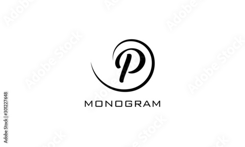 Monogram. Typographic logo with capital letter P. Icon lettering style with decorative swirl in black isolated on light background.