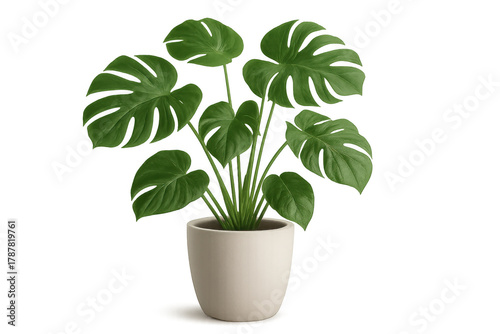 Monstera deliciosa houseplant in white pot with large green leaves on transparent background