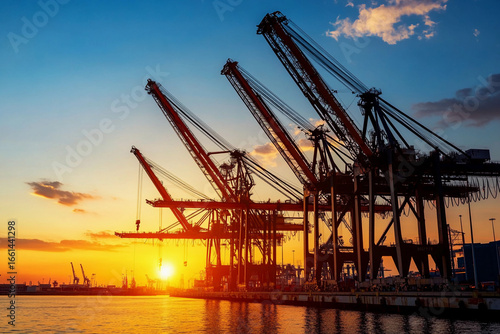 Monumental cranes work at sunset in busy port Generative AI