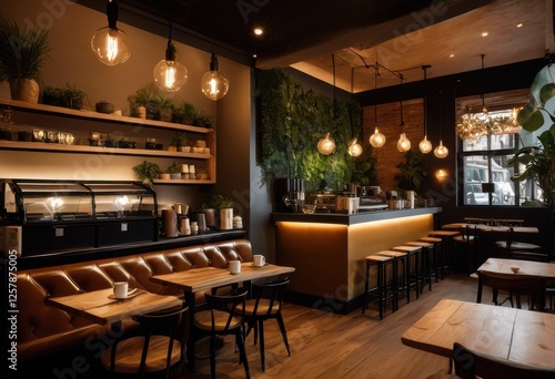 moody coffee shop interior featuring cozy atmosphere soft atmospheric lighting creating unique sophisticated ambiance customers, design, furniture, table