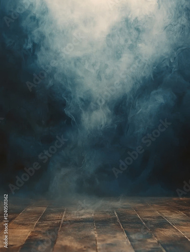smoke, fog, misty, mysterious, dark, moody, dramatic, atmospheric, wooden floor, grunge, textured, background, scene, setting, environment, studio, effect, abstract, design, texture, board, wood, plank, floorboard, vapour, haze, blue, grey, dark blue, teal