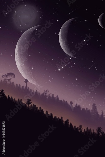 night, moon, sky, star, star, space, dark, nature, light, landscape, astronomy, moonlight, silhouette, blue, full, tree, tree, illustration, planet, galaxy, black, vector, mountain, forest, winter