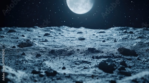 Moon surface landscape with crater details under a bright moon in a starry sky showcasing Copy Space.