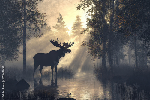 moose, forest, sunrise, mist, wildlife, nature, majestic, animal, silhouette, early morning, peaceful, scenery, wild, outdoors, timberland, antler, golden light, tranquil, environment, misty, beautiful, dawn, serene, quiet, sun ray, autumn, morning light, soft light, wilderness, atmospheric, calm, contemplative