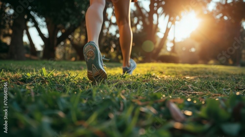 Morning jog in sunlit park, focus on runner's shoes on grassy trail, health and fitness concept.