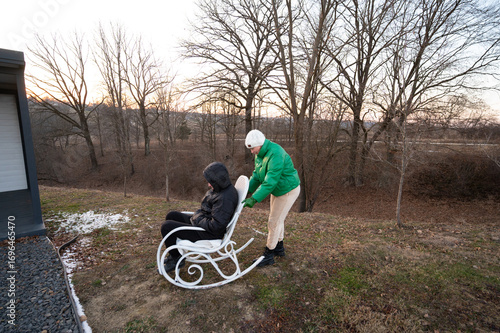 morning, calmness, rocking chair, friends, nature, sunrise, landscape, relaxation, connection, peaceful, winter, cold, tree, togetherness, atmosphere, serenity, laughter, bonding, joy, fresh air, exploration, casual attire, warmth, companionship, leisure, friendship, movement, gentle, grass, dirt, environment, beauty, simplicity, harmony, moment, enjoyment, scenic, joyfulness, stillness, calmness, scenery, rural, lifestyle