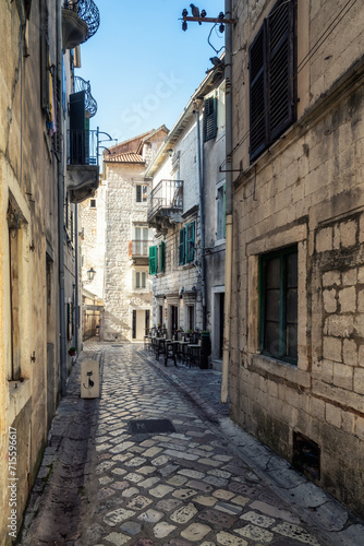 Morning walk along winding narrow streets with ancient stone buildings in the old town of Kotor, Montenegro